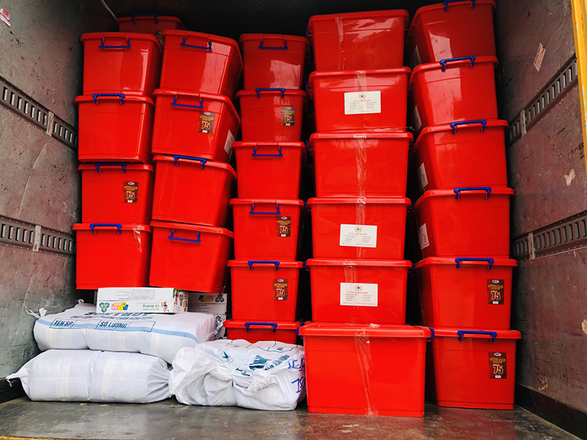 Các thùng hàng sản phẩm gia đình được Hội chữ thập đỏ tiếp nhận và chuyển đến các tỉnh miền Trung thông qua Bưu điện Việt Nam