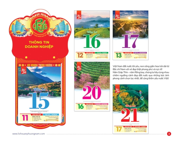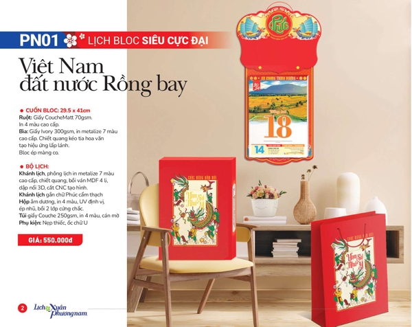 - Bộ lịch: Khánh lịch, phông lịch in metalize 7 màu cao cấp, chiết quang, bồi ván MDF 4 li, dập nổi 3D, cắt CNC tạo hình. Khánh lịch gắn chữ Phúc cẩm thạch Hộp âm dương, in 4 màu, UV định vị, ép nhũ, bồi 2 lớp cứng chắc. Túi giấy Couche 250gsm, in 4 màu, cán mờ Phụ kiện: Nẹp thiếc, ốc chữ U